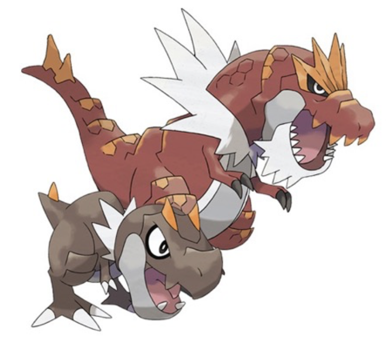 Tyrunt and Tyrantrum are based on the famous Tyrannosaurus Rex. This enormous dinosaur was 40 feet long and 15 feet tall. Its 4-foot-long jaws had teeth the size of bananas, which were capable of biting through bone. In addition to attacking prey, the T-Rex species fought each other for unknown reasons, shown by T-Rex fossils that have bite marks from other Tyrannosaurs. Tyrannosaurus Rex has understandably been depicted in films such as Jurassic Park to be a ferocious and quick predator, but this may not be factually accurate. Evidence has shown that the T-Rex could only move at around 10-20 MPH, and some scientists think that it may have been a scavenger.